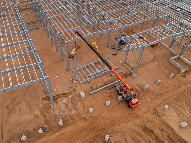 Челичните компоненти, вклучувајќи греди, колони, загради и бандажи на покривот, се префабрикувани во фабрички амбиент. Се користи висококвалитетен челик, а компонентите се произведени на прецизни спецификации за да се обезбеди дека тие се вклопуваат заедно точно и безбедно за време на инсталацијата. Ова контролирано опкружување овозможува строги мерки за контрола на квалитетот, обезбедувајќи издржливост и сигурност на компонентите.
