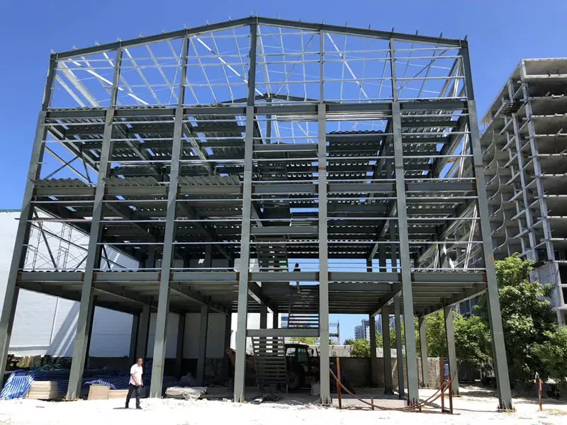3. Изработка на челична конструкција Челичните компоненти, вклучувајќи греди, столбови, загради и покривни фарми, се префабрикувани во фабрика со користење на висококвалитетен челик. Прецизното инженерство обезбедува овие компоненти точно и безбедно да се вклопат заедно за време на инсталацијата.