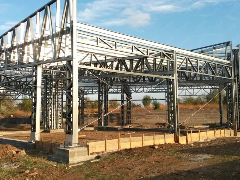 4. Поставување на челична конструкција Префабрикуваните челични компоненти се транспортираат до градилиштето и се склопуваат со помош на кранови и друга тешка опрема. Процесот на инсталација започнува со подигнување и закотвување на столбовите на темелот, проследено со поставување на греди за формирање на рамката на складиштето. Потоа се прицврстуваат фармите на покривот за да го поддржат покривниот систем.