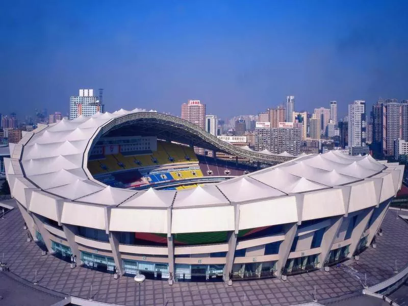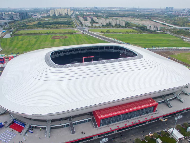 3. Главната структура усвојува голем простор на просторна бандаж или мрежен систем, создавајќи отворен простор без колона, обезбедувајќи непречено погледи за сите гледачи и можност за покривање на супер голем покрив за да ги исполни барањата за употреба на сите временски услови.